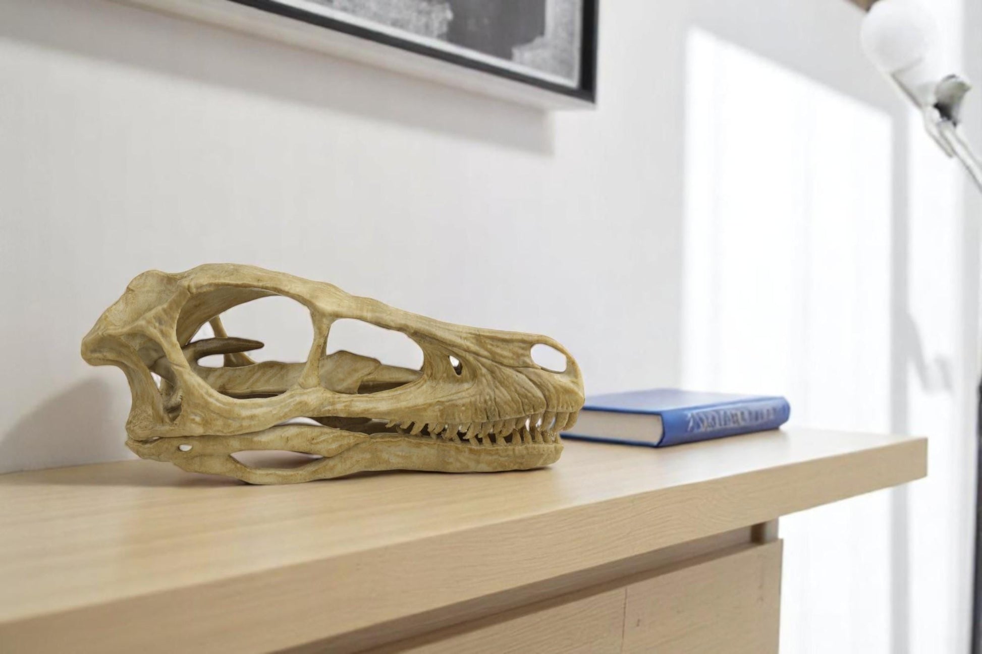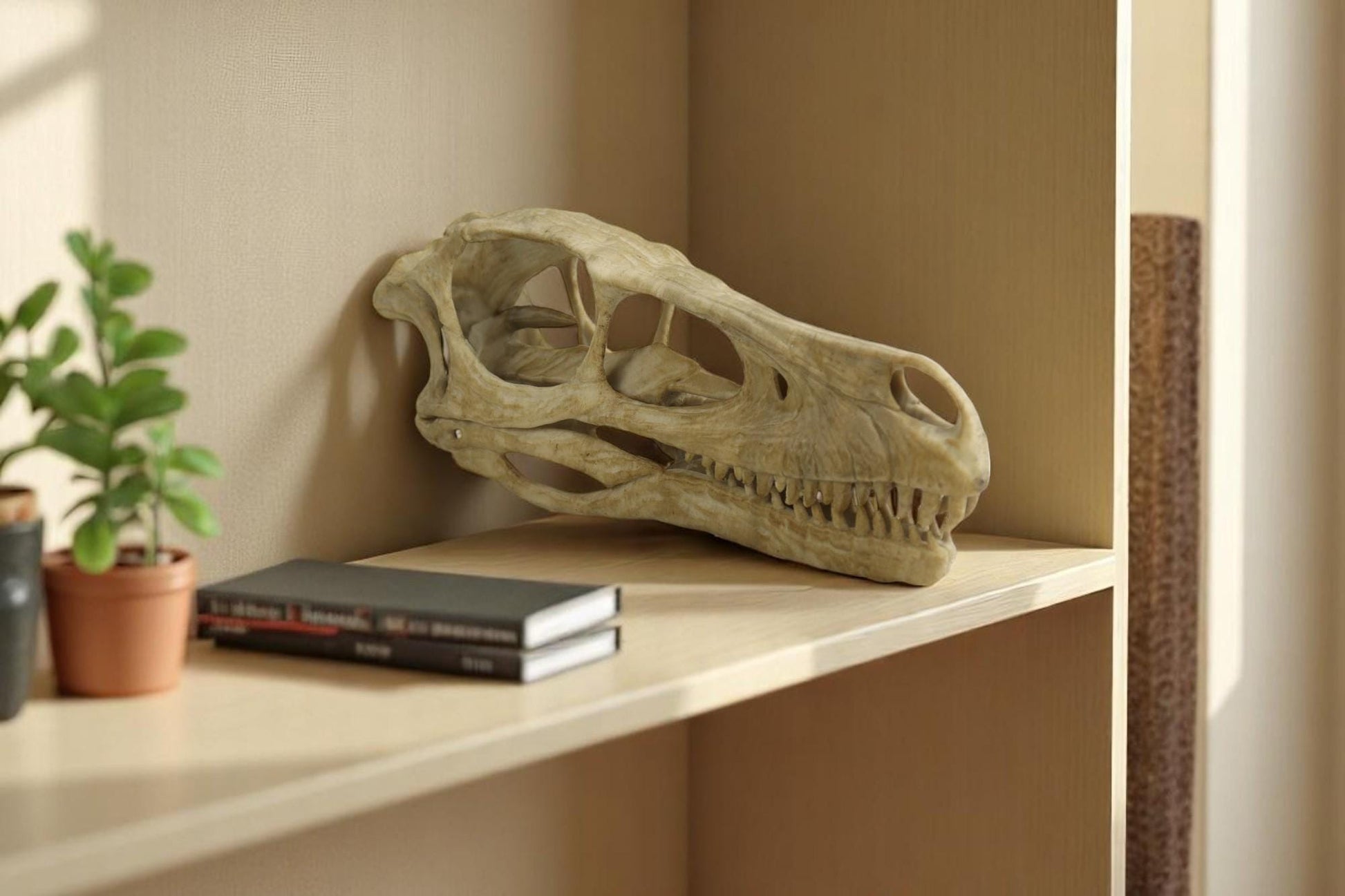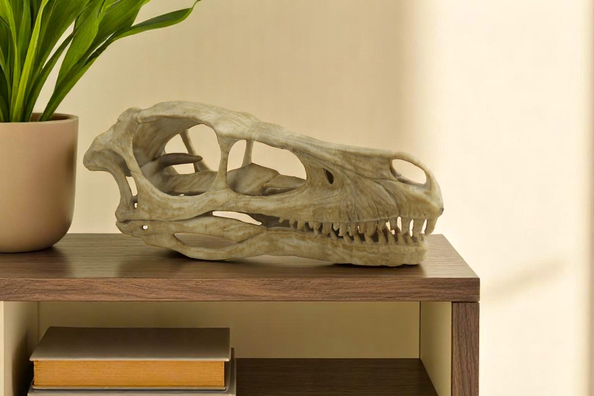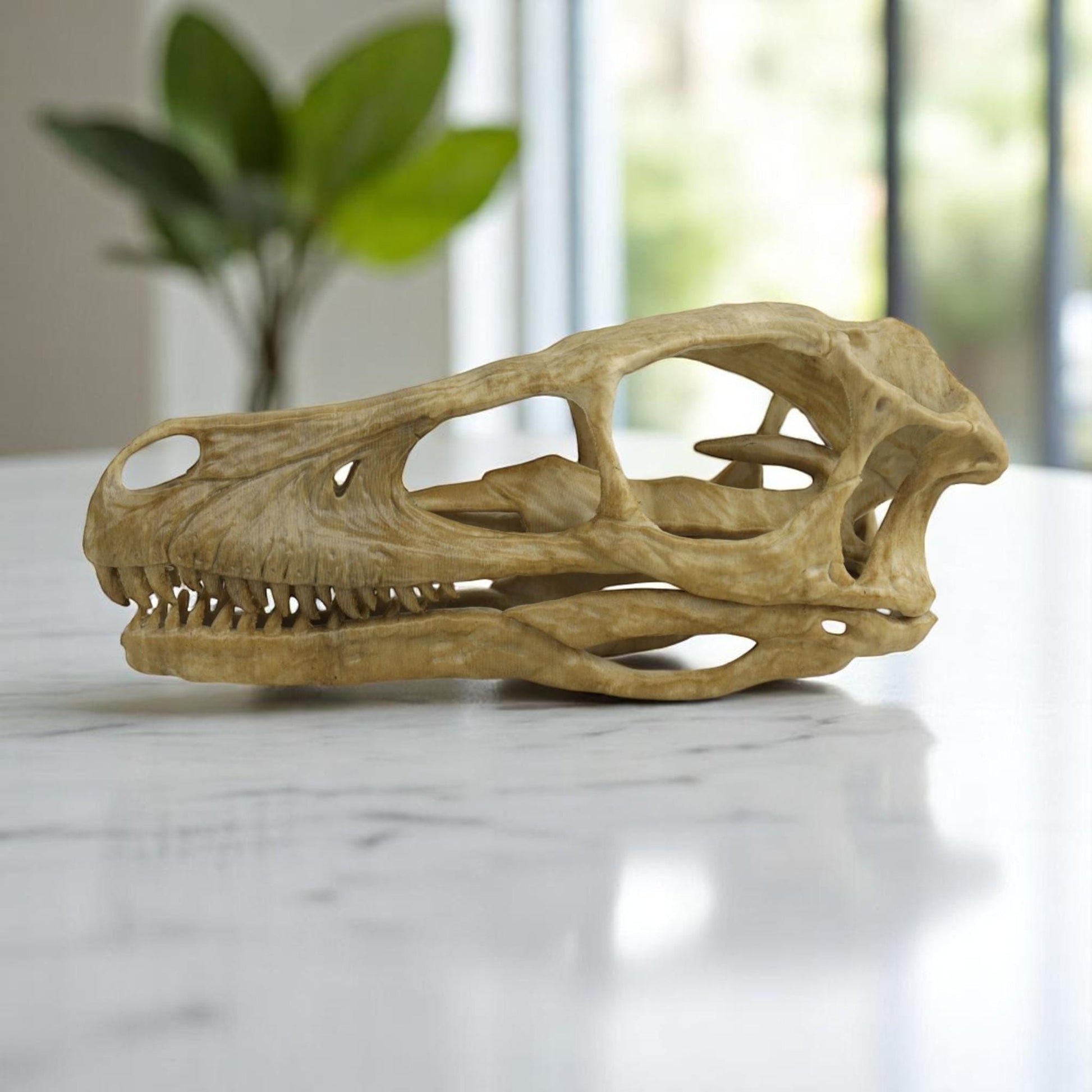 Aged Velociraptor Skull Replica, Perfect for Dinosaur Enthusiasts and Home Decor