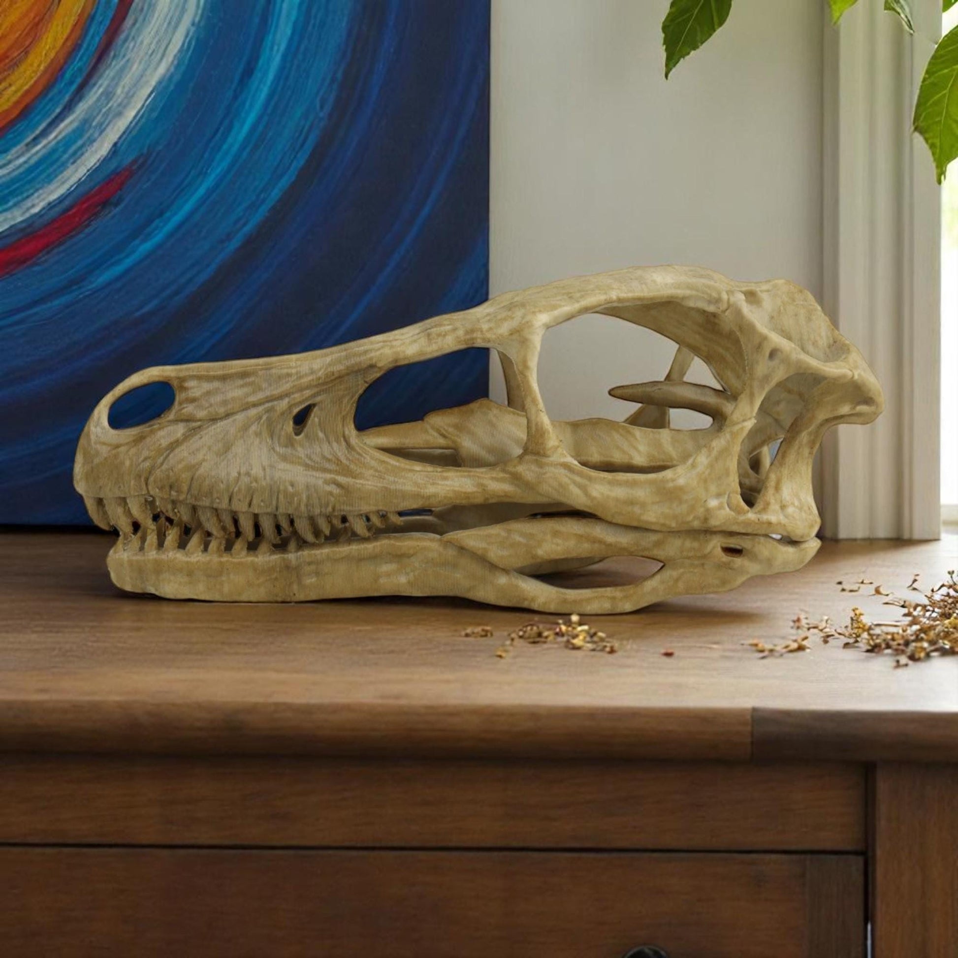 Bring the awe-inspiring world of dinosaurs into your home with this beautifully handpainted Velociraptor Skull replica. Handcrafted with stunning attention to detail, this fossil-inspired piece features realistic textures and finishes that capture the raw beauty of prehistoric times. Ideal for collectors, paleontology enthusiasts, or anyone who appreciates unique, educational home decor. Whether displayed on a bookshelf, desk, or as a striking focal point in your living room, this Velociraptor skull adds a touch of ancient wonder to any space. The perfect gift for dinosaur lovers, history buffs, or fans of natural history.