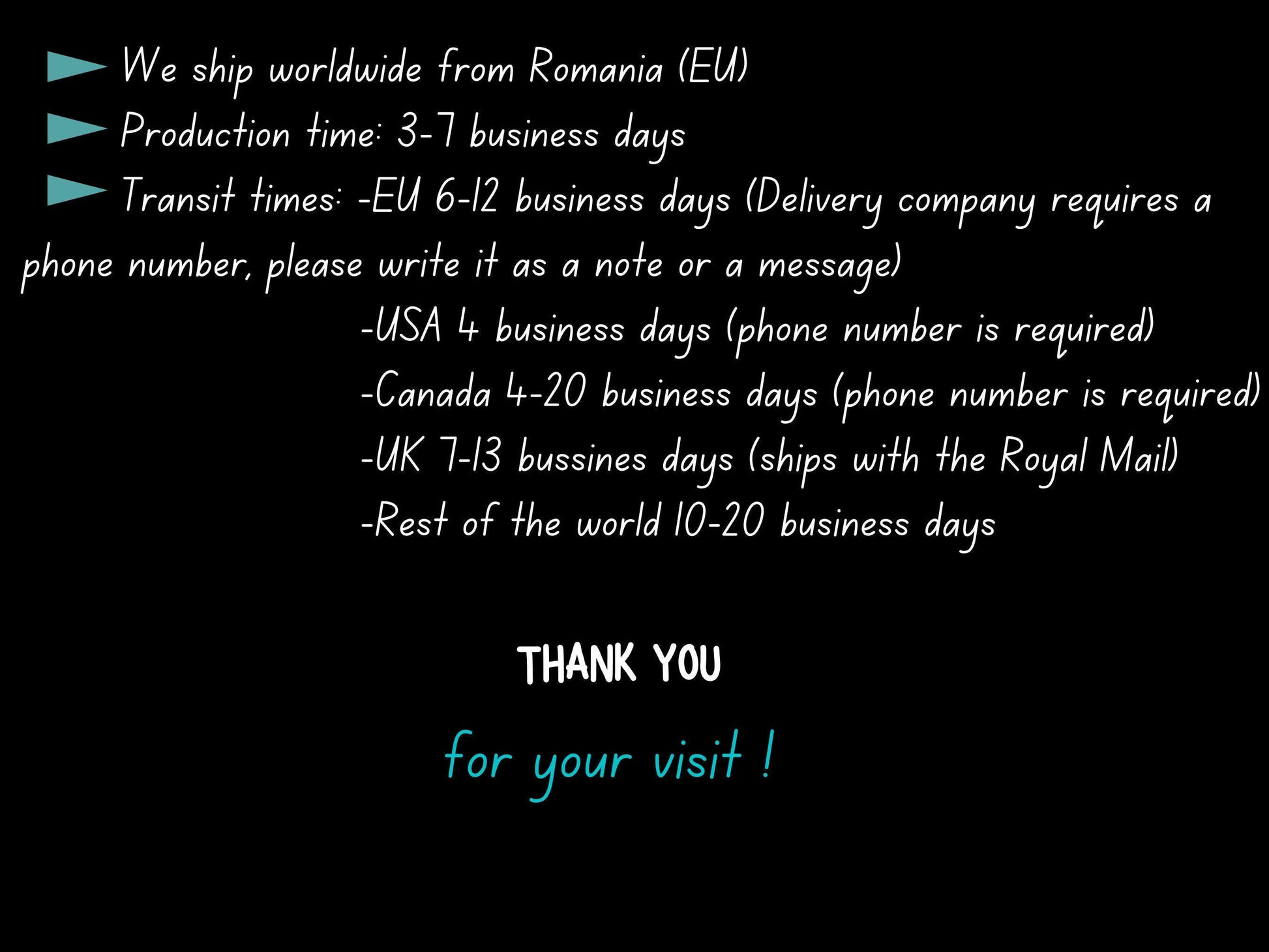 ✯ Delivery time to EU: 7-13 business days* (shipping with the local couriers, delivery companies require a phone number to contact you for delivery, please provide a phone number as a note or as a private message)